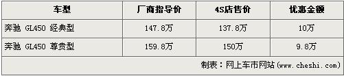 据经销商处销售人员介绍,目前国内在售的奔驰GL级分为GL450 经典版与GL450 尊贵版,上个月两款车型的优惠金额分别为3万元和4.8万元,近日奔驰GL系的优惠金额暴增,优惠近额分别涨到了10万元和9.8万元。经优惠后,低配车型的经典版售价将为了137.8万元,首次跌破140万,高配的尊贵版车型售价也降为了150万元。