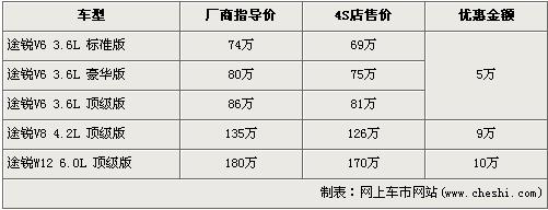 据经销商销售人员介绍,目前店内途锐全系均有不同优惠,最高让利达到了10万元。搭载V6发动机的3.6L车型优惠现金5万元,3.6L车型经优惠后售价分别为:标准型69万元,豪华型75万元,顶级型81万元;搭载V8发动机的3.6L顶级型经9万元优惠后售价降到了126万元;搭载W12发动机的全系顶配车型6.0L顶级版经10万元的优惠后售价从180万降到了170万元。