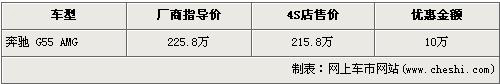 根据北京奔驰4S店销售人员介绍,目前奔驰G55 AMG现金优惠10万元。经优惠后,奔驰G55 AMG售价从厂商指导价的225.8万元下降到了215.8万元。销售人员还介绍,奔驰G55 AMG只有一部黑色现车在售,而且北京多家奔驰经销店均无现车,消费者挑选的空间不大。颜色方面引进国内的G55 AMG只有黑色,其他颜色均不销售。