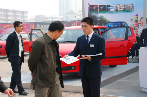中新网4月19日电在2009(第六届)全国百强县市汽车巡展寿光站的现场笔者发现了这样的一幕,与其他厂商不同,上海大众斯柯达的经销商潍坊天和汽车销售服务有限公司的销售人员,不但在展位为前来咨询的消费者进行讲解,而且还走出展位,走到展位外面为消费者讲解,吸引消费者来了解更多车辆信息。