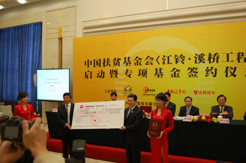 中新网4月19日电 近日,江铃汽车股份有限公司确再次慷慨解囊,向中国扶贫基金会“江铃•溪桥工程”建桥基金捐款100万元人民币,自此,江铃汽车股份有限公司已连续三年捐款100万元,从而使“江铃•溪桥工程”成为可持续发展的公益项目。