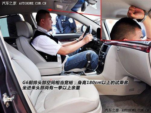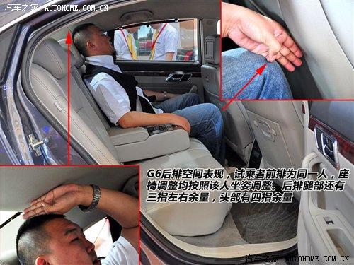 对于这种大尺寸车型最惯性的思路是感受它的空间。G6前排坐进180cm以上乘客时,头部还有一拳以上余量。同一个人体验后排,腿部三指、头部四指的空间余量只能说比较一般。