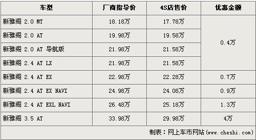 据4S店销售人员介绍,目前新雅阁全系优惠最高达到了4万元。新雅阁分为2.0、2.4、3.5三个排量,全系最低配的2.0手动版经4000元优惠后售价降到了17.78万元,2.4L车型高配的EXL NAVI版经1.3万元优惠后售价降到了25.18万元,而3.5排量车型优惠4万元达到了全系的最高。销售人员还介绍,除了最低配的车型无现车外,其他车型均有现车。