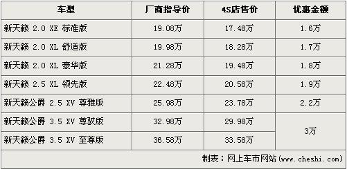 根据4s店销售人员介绍,近期购买新天籁的消费者可以享受到全系最高3万元的优惠。新天籁车型分为2.0、2.5以及3.5三个排量,3.5L车型目前让利3万元达到了全系的最高,经优惠后3.5 尊驭版和3.5至尊版售价分别降到了29.98万元和33.58万元。而其他两个排量车型则采用的是买车购置税减半的优惠政策,根据消费者要求的不同,减去的一半购置税也可以抵车价。全系入门级的2.0标准版经优惠后,售价跌破18万元,仅为17.48万元。优惠销售人员还介绍,新天籁全系均无现车,欲购买车需交订金1万元,约等1个月可提车。