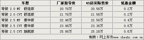 东风日产奇骏自去年11月上市以来一直备受消费者关注。国产后的奇骏填补了东风日产在SUV领域的空白,为那些对越野性有更多需求的城市SUV消费者提供了更多的选择机会。根据网上车市价格监测系统显示,奇骏现车供应仍然比较紧张,但较前一阵有所缓解,全系车型均出现了价格浮动。2.5顶配和豪华自动档车型的优惠幅度均已达到了6000元。