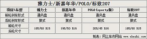四款车型的前后刹车形式都是通风盘+蹄鼓式刹车,轮胎尺寸方面新建年华运动版和POLO Sporty两款用到了更大的16寸轮胎并且宽度也更宽,非常符合这两款车型突出运动性的定位。而雅力士和标致207的15寸车轮配合185轮胎宽度在同级别车型中也是中规中矩的配置。