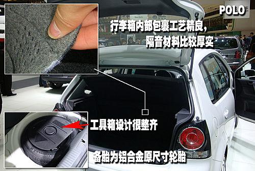 上海大众polo是唯一标配铝合金轮毂全尺寸备胎的车型,行李箱内部的包裹材料相比新建年华而言更加厚实和柔软。位于备胎内部分工具箱设计的很有特色,完全没有凌乱的感觉非常的整齐。