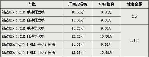 凯越HRV最高优惠2万元,导航版与运动版车型优惠升至1.7万元,具体详情请看下表: