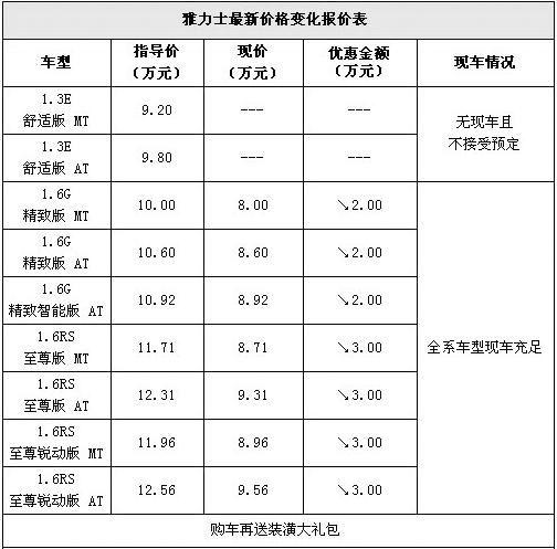 雅力士在沪最高优惠达到了3万元,全系车型的价格都跌破了10万元大关。其中部分主销自动挡车型的价格也都跌破9万元。具体详情请见下表:
