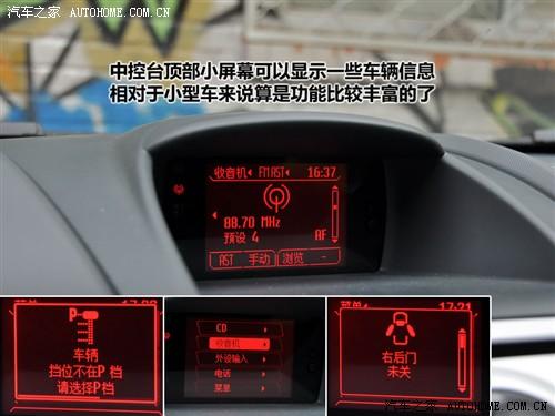 中控台顶部的显示屏虽然很小,但是在小型车中还是不多见的,而且功能也比较丰富,包括时间、音频、车辆信息和一些简单功能设置。比如可以调节音效,收音机的选台存台,CD播放等,基本上以音频信息为最有用的。此外,还有车辆警示信息,比如车门未关、自动挡挡位没在P挡等,而且警示信息显示时还有红色进度条一直在行进,进度条结束了信息也就不显示了。