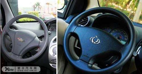 瑞麒M1和熊猫都采用三幅式方向盘设计,瑞麒M1的方向盘中间的LOGO依然使用奇瑞老式车标,方向盘高低可以调节,适合不同身材的驾驶员使用。吉利熊猫则采用了全新的车标,再设计上达到了统一,这一点奇瑞可能在后续车型上会采用全新的车标。