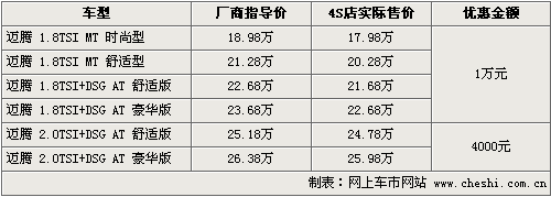 笔者从一汽大众北京地区经销商处了解到,目前销售的迈腾大多为DSG版车型,其中1.8T车型可以现车优惠1万元,2.0排量优惠4000元,如果消费者选择在4S店内做一条龙服务,还将有一定幅度的优惠。除新款DSG版车型外,部分4S店还有少量的老款迈腾销售,现车主要为黑色、银色等。