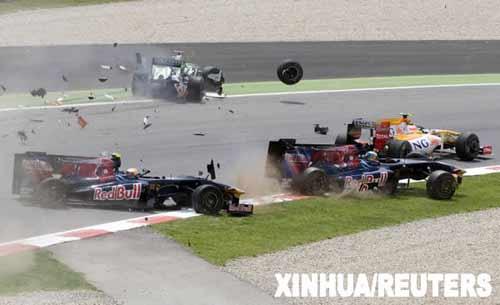 5月10日,红牛二队车手布尔代(前中)和队友布埃米(前左)以及印度力量车队车手苏蒂尔(后)、雷诺车队车手皮盖驾驶的赛车发生碰撞。当日,F1西班牙大奖赛落幕,布朗GP车队的英国车手巴顿夺得冠军。新华社/路透