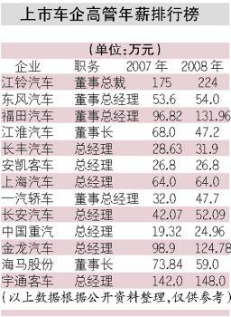一般而言,年度薪酬是和整个行业效益成正比的,但从附表所列的情况来看,除了江淮汽车和海马股份的董事长因为去年业绩下滑厉害而自降薪酬外,其余车企掌门人的薪酬与2007年相比基本是稳中有涨,其中上海汽车与安凯客车则是与2007年持平,江铃汽车、福田汽车和金龙汽车的掌门人2008年的薪酬同比2007年增长了三成左右,都在100万元以上,足以让乘用车企负责人“眼红”。上海汽车、长安汽车和一汽轿车这些规模庞大的乘用车的一把手的薪酬也不过65万元。