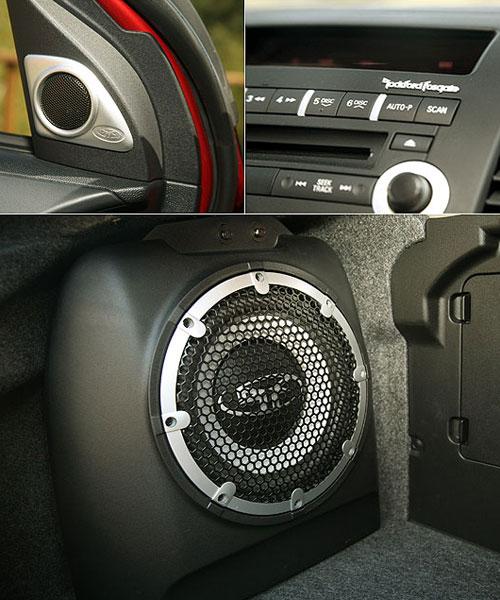 相较于在日本试驾那台中控台仅有置物盒设计,可说是阳春到底的EVO X,国内这台EVO X的中控台配备可说是豪华演出,除了有国人熟悉的Lancer车系音响模块外,中华汽车也将Rockford Fosgate音响系统列入座舱配备清单内,成为少数值得拿出来特别介绍的座舱娱乐配备,这组音响系统含四门扬声器、两颗高音扬声器与行李箱重低音扬声器在内,总共有多达9声道(双前门为双扬声器设计)。