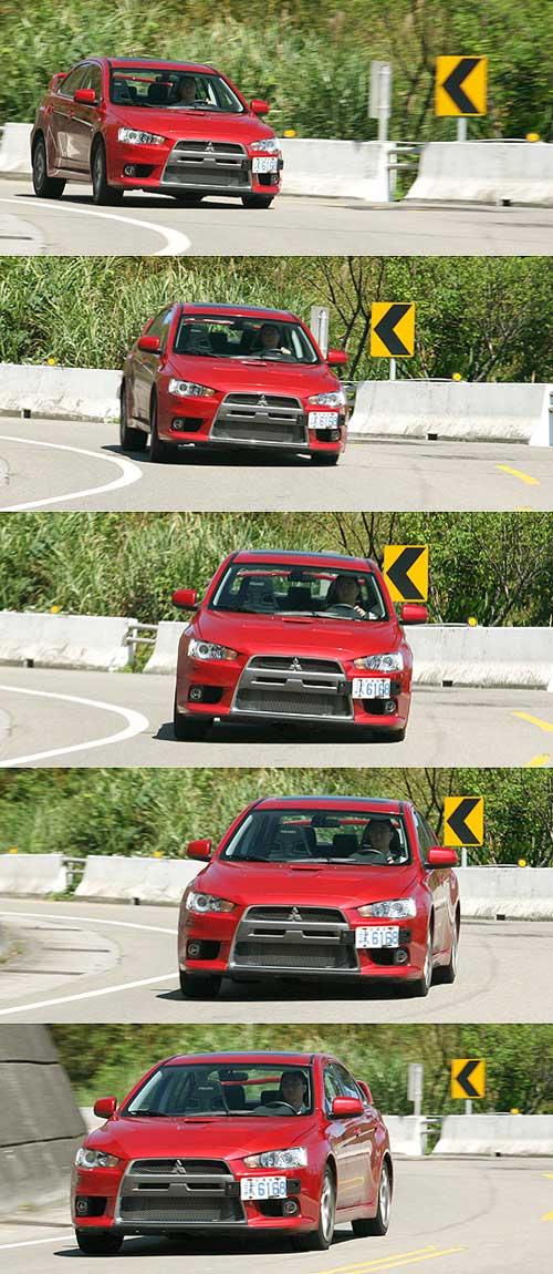 接着说到弯道的底盘反应,EVO X明显有四驱车的偏中性转向特征,但是仔细感受之后,弯道循迹过程的细腻反应,却又与以往体验的许多四轮驱动车有所差异,不同于四平八稳到几近无趣的四驱轨道车路线,EVO X在高速过弯时,驾驶会略微感受到AYC主动偏摆控制系统,在随时调整后方左右轮扭力输出时,让车尾时有徐徐轻浮扭摆的动作,不是ASC稳定系统启动那种明显的转向修正动作,而是感觉让车尾左右轮扭力的些微落差,发挥弯外侧后顺势将车尾紧密推入弯内,呈现出接近弯顶点时,循迹路线会有略偏移至些许转向过度的特性,让车头紧紧抓住驾驶要切入的方向。