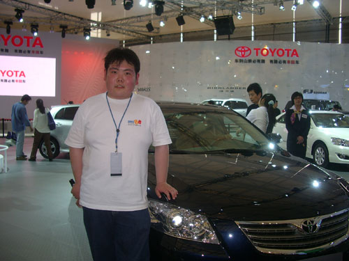 小胖在丰田展台流连不返,看起来非常喜欢丰田展台的车型,尤其是这款蓝色的凯美瑞,小胖在其中试坐了一会儿,对凯美瑞的空间感到很满意。小胖因为照片被网络上的PS达人们恶搞而走红,这次车展上担任东方宽频网的特邀现场主持人,所以他还特别在节目录制中介绍了凯美瑞,并非常开心地与凯美瑞合影留念。