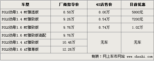 据销售人员介绍,目前POLO劲情全系优惠幅度从3900元-6000元不等,优惠后售价从8.19万-10.56万元。同时,近期推出的POLO运动款也受到消费者喜爱,据销售介绍,现车到店即买。运动款主要有蓝色、黑色以及白色。目前POLO劲情以及运动版均已没有现车供应,需预定,订金为1万,一个月时间才能提车。
