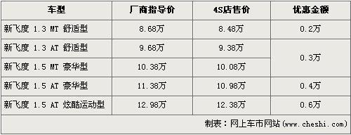 据广州本田北京地区4S店销售人员介绍,新飞度 1.5L炫酷运动版的优惠金额为6000元。新飞度在售车型分为1.3L及1.5L共5个车型在售,1.3L手动舒适版的优惠金额为2000元,现售价为8.48万元。1.3L自动舒适版的优惠金额为3000元,现售价为9.38万元。1.5L豪华版的手动和自动车型经4000元优惠后,现售价分别为10.08万元和10.98万元,1.5L炫酷运动版的优惠6000元,现售价为12.38万元。