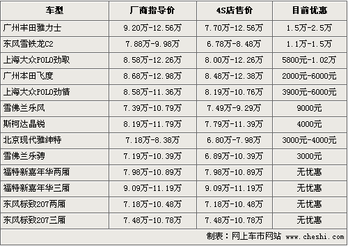随着石油价格逐步上涨,小排量车逐渐受到消费者亲睐。为了争得市场,各汽车品牌推出的1.6L以内AO级车型数量和款式越来越多,竞争也随之加剧。以下我们总结的13款AO级车型价格均在7万-13万之间,排量覆盖了1.2、1.3、1.4、1.5和1.6五个区间,可供选择的空间非常大,而价格优惠从2000元-2.5万元不等,在消费者购车时既可以享受小排量购置税的优惠政策,也可以得到4S店的降价优惠,既省车钱,又能少花油钱。具体车型以及价格优惠参考如下: