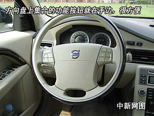 方向盘给人的第一感觉是漂亮,握在手里很充实。为了增加安全性,国产沃尔沃s80L 3.0 T6 AWD智尊版的方向盘使用了桃木方向盘,这种方向盘外侧是胡桃木,内侧为真皮,两种材质被一条细细的铝金属带隔开,这种设计既防止实木光滑的表面可能造成的不安全因素,也增加了真皮的视觉和尊贵效果。方向盘上集合的功能按钮就在手边,使用时不用刻意去够,很方便。