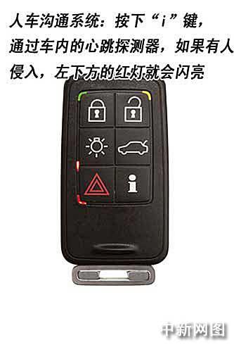 人车沟通系统(PCC)是沃尔沃汽车公司所独的,将PCC随身携带,在您到达车边时汽车将自动开锁。按下仪表盘上的按钮即可启动发动机。按下信息按钮,就可以知道车门锁闭状态以及车内的各个系统是否正常关闭。一个很特殊的设置是,根据沃尔沃工作人员的演示,按下“i”键,就可以通过安装在车内的心跳探测器知道车内是否有人,防止乘客被误锁或车辆被非法侵入的情况。(陈鑫)