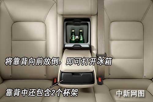 在后座中间座位靠背后方有一个冰箱。将靠背向前放倒,即可打开冰箱,同时,靠背中还有2个杯架,方便乘客在旅途中放杯子。