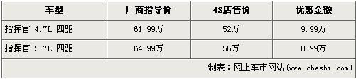 据经销商处销售人员介绍,由于现在在售的指挥官车型均为大排量消费税推出后入关的车型,所以厂商指导价都是调整后的价格,售价分别为61.99万元和64.99万元。近期购买指挥官的消费者可以享受到最高9.99万元的优惠,4.7L排量车型经9.99万优惠后,售价降到了52万元,5.7L车型经8.99万元优惠后售价也降到了56万元。