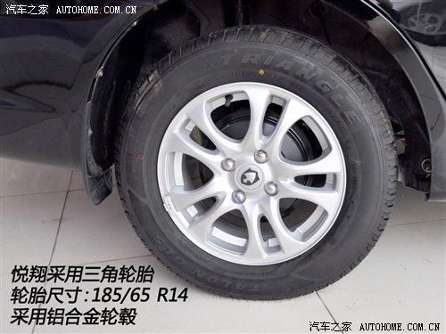 悦翔共有四种配置,装备了相同的185/65 R14轮胎,相对来说14寸轮毂过于小气,影响了这款车的外观。其中基本型和舒适性配备钢轮毂,豪华型和尊贵型配备铝合金轮毂。备胎都是175/65 R14,钢制轮毂。因此悦翔是非全尺寸备胎。