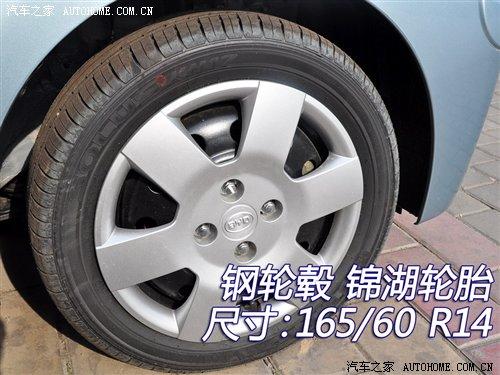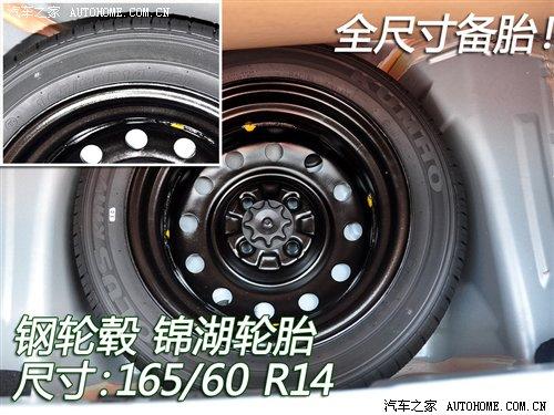比亚迪F0的四款车型都装备了尺寸为165/60 R14的锦湖轮胎,其中高配的尊贵型和旗舰型采用的是铝合金轮毂。我们实拍的这款车配备的是钢轮毂,显然是低配车型。四款车的备胎都是尺寸165/60 R14的锦湖轮胎,钢轮毂。因此在这辆低配车上是全尺寸备胎。