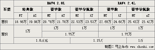实现国产化后的RAV4分有2.0L与2.4L两种排量并分别提供手动挡与自动挡车型,同时也因变速箱的差异,在RAV4全系的AT与MT车型间也就有了1万元的差异。同样,由于配置的不同,经典版RAV4与豪华版间的差价为1.8万元,豪华版与顶配豪华导航版车型也存在着1.75万元的差价。而因搭载了不同排量的发动机,RAV4 2.0L豪华导航版和2.4的豪华版车型的差价为1.15万元。