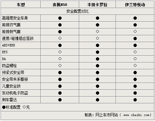 在安全装备上,奔腾B50五款车型采用的是同样的配置,前排双气囊、驾驶员自动预紧安全带、驾驶员安全带未系报警等都为标配,防炫目内后视镜、后门儿童锁、间歇式宽幅雨刷都为保障驾驶安全设计。对比另外两款车型则少了EPS以及BA等辅助安全系统。