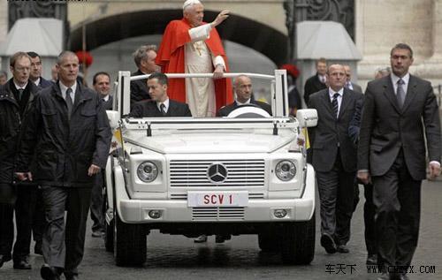 应教皇本人的要求,奔驰公司为其专门生产了一辆敞篷版的白色G500教皇专用车,该车的研发过程历时两年。教皇将用这辆梵蒂冈专用白色敞篷车在圣彼得广场进行惯常的周三赐见活动。