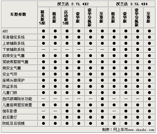 国产汉兰达的安全配置还是比较齐全的,所有车型都配备的ABS、EBD、车身稳定系统、7安全气囊等装备,尤其是车身稳定系统已经成为了汉兰达的标准配置,该项配置可以大大提高车辆行驶中的安全性能。汉兰达3.5排量的车型在配备了上坡辅助系统的同时,还配备了下坡辅助系统,大大提高了该车的越野性能。顶配车型上还配备了挡风玻璃除冰功能,这是该级别车型中很少见到的。