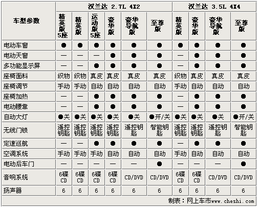 汉兰达身为一款中高级SUV车型,所以在豪华配置上还是比较全面的,除了精英型车型外,其它车型的座椅都是真皮材质的,而且还配备了座椅电动调节、加热和电动腰靠,大大提升的汉兰达的品质。国产汉兰达的全系车型都配备了6喇叭的音响系统,高配车型配有DVD影音系统。顶配车型的尾门为电动开启和关闭,大大的方便乘客使用。