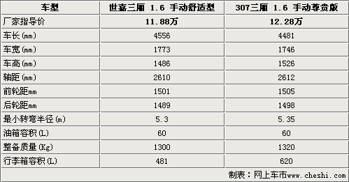 东风雪铁龙世嘉三厢1.6手动舒适型和标致307-1.6手动舒适型都可以称得上是该车款中的主力车型,两款车型的定价相差了4000元整。在车身尺寸方面世嘉三厢车长和车宽方面都要优于标致307尺寸。两款车型的轴距均在2600mm左右,该尺寸在同级别车型中比较少见,完全可以满足一般乘客的使用需求。307的车身高度达到了1526mm,这一点保证了其内部高度的宽敞。标致307的行李箱容积达到了620升,可以称上是海量了,而世嘉三厢仅达到了481升。标致307的前后轮距都要大于世嘉三厢,意味着标致307操控性要优越于雪铁龙世嘉。