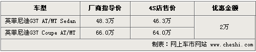 笔者从英菲尼迪北京地区经销商处了解到,目前英菲尼迪G37销售的车型包括四门版和两门版车型,售价为48.3万和66万。现在消费者购车的话可以优惠2万元的现金,优惠后售价为46.3万元。这款车有银色、黑色、红色、白色/蓝色等可提供给消费者选择,购车的消费者可到店具体咨询。