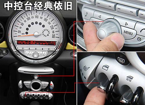 新一代Mini Cooper和Mini Cooper S敞篷版中控台自上而下依然熟悉的大圆形时速表、音响调节按钮及旋钮、CD机头、自动空调及车窗和中控门锁等控制开关,与其它Mini车型如出一辙。