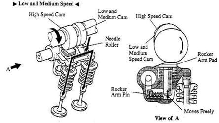 在可变气门正时方面HONDA发动机具有一定得领先性他的发动机在低负荷运转情况下,小活塞在原位置上,三根摇臂分离,主凸轮和次凸轮分别推动主摇臂和次摇臂,控制两个进气门的开闭,气门升量较少,其情形好像普通的发动机。虽然中间凸轮也推动中间摇臂,但由于摇臂之间已分离,其它两根摇臂不受它的控制,所以不会影响气门的开闭状态。但当发动机达到某一个设定的高转速(例如3500转/分时,本田S2000型跑车要达到5500转/分),电脑即会指令电磁阀启动液压系统,推动摇臂内的小活塞,使三根摇臂锁成一体,一起由中间凸轮驱动,由于中间凸轮比其它凸轮都高,升程大,所以进气门开启时间延长,升程也增大了。当发动机转速降低到某一个设定的低转速时,摇臂内的液压也随之降低,活塞在回位弹簧作用下退回原位,三根摇臂分开。这样一来就保证了您在低转速时对油耗的控制,同时满足你在发动机处于高转速下澎湃动力输出的需要。整个VTEC系统由发动机主电脑(ECU)控制,ECU接收发动机传感器(包括转速、进气压力、车速、水温等)的参数并进行处理,输出相应的控制信号,通过电磁阀调节摇臂活塞液压系统,从而使发动机在不同的转速下由不同的凸轮控制,影响进气门的开度和时间。从而产生出您最希望获取的动力输出。