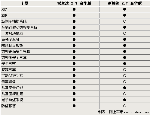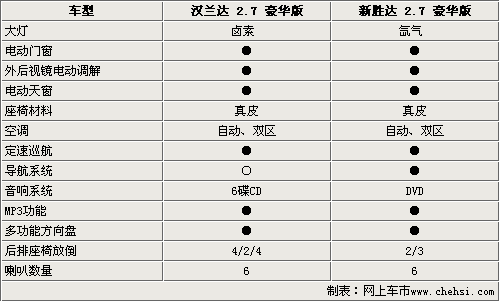 国产汉兰达2.7豪华版和新胜达2.7豪华版的舒适配置可谓是应有尽有,电动天窗、真皮座椅、自动空调、定速巡航、多功能方向盘等设备都成为了标准配置。新胜达配备了导航系统和DVD影音系统,而汉兰达豪华版的这两项项配置均为选配。在后排放倒比例上,汉兰达最为灵活多变,放倒比例达到了4:2:4,可以更加有效的方便乘客置放大件物品,新胜达后排座椅只可以按2:3的比例进行放倒。