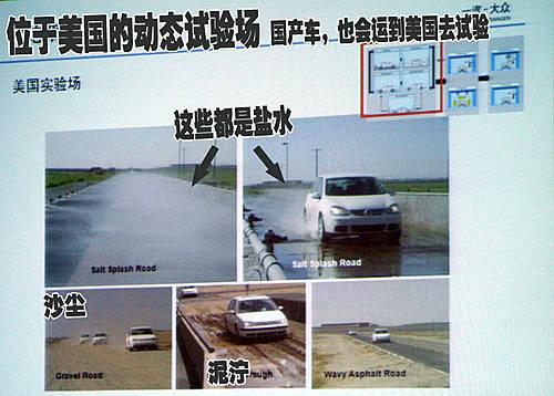 一台车辆经常要行驶在各种各样的路况条件下,大众的海外测试基地包括:芬兰--严寒零下40°,一次启动;美国--腐蚀-暴晒-夏季路试(暴晒试验场,自主车、零部件,暴晒一年);南非--南北半球日照最强烈地区;每年大众高层领导,都必须要到夏季路试的地方,去亲自体验那里的极端环境,据说这里在美国的试验场地白天的体感温度就有50°之多。