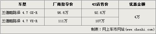 据经销商销售人员介绍,丰田-兰德酷路泽分为4.0L和4.7L两种排量,由于4.0L车型的尾气排放是欧III标准,没有达到北京施行的欧IV标准,所以北京限卖,店内没有4.0L车型。4.7L车型分为GX-R版和VX-R版,目前购买兰德酷路泽的消费者可以得到4万元的优惠。经优惠后,GX-R版售价降为了92.6万元,VX-R版售价降到了107万元。销售人员还介绍,店内没有兰德酷路泽现车,预购买者需交订金1万元,约等一个半月可提车。