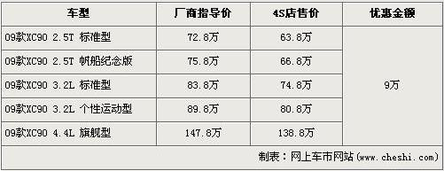 据沃尔沃经销商处销售人员介绍,目前店内的09款XC90车型全系都有9万元的现金优惠,并且此次优惠活动截止到7月1日。经优惠后,2.5T标准型的售价跌破70万元,仅售63.8万元。2.5T 帆船纪念版经9万元优惠后,售价从75.8万元下降到了66.8万元。两款3.2L排量车型经优惠后售价降为74.8万元及80.8万元,顶配的4.4L旗舰车型售价降为了138.8万元。销售人员还介绍,XC90全系车型齐全,消费者挑选的空间较大。