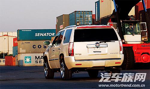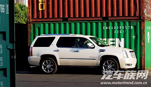 从货场驶出,一路上被大货车压坏的路面坑坑洼洼,这时MRC主动电磁感应悬架自动调节阻尼,高大的车身在颠簸路面上快速前进,而乘客感到的仅仅是轻微晃动。驶离港区,眼前出现笔直的高架公路,轻点油门,车速很快提高到100公里/小时。这时从具有AudioPilot噪音补偿技术的Bose音响中流出的音乐依然保持纯净,并未因宽大的车身和285宽胎所产生的些许噪音而受到影响。此外,可能是灵敏的悬架已经自动调高阻尼,美国车特有的忽忽悠悠的如坐船般的感觉却并没有出现在我们的凯雷德身上。