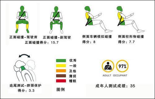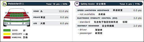 上图描述的是车辆对于路人的保护情况和安全辅助设备配置情况。路人安全在欧洲已经普遍重视,很多检测项目已经有了很清晰的标准。图中看出,高尔夫6代翼子板部分对行人伤害是比较重的。在安全配置方面,高尔夫6代标配了ESC,也就是我们国内常说的ESP,不知道国产版本会不会“偷工减料”。驾驶席和副驾驶的安全带提醒装置都为高尔夫6代的最终成绩做了加分。
