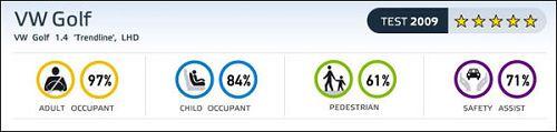综合来看,高尔夫6代获欧洲碰撞测试实验室5星评价。对成员保护得分率97%,对儿童保护得分率84%,对行人保护得分率61%,安全辅助装备得分率71%。
