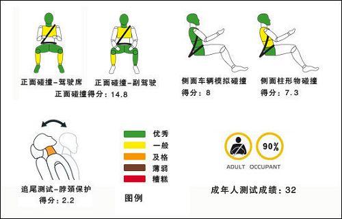 昊锐在正面碰撞中对驾驶员与乘客的胸部保护一般,头部和盆骨保护最好,驾驶员小腿可能受踏板变形有所伤害。在侧面模拟车体碰撞试验中,昊锐对驾驶员保护良好获得满分,但柱体碰撞中对胸部保护不过。对于颈部保护试验,昊锐只获得了边缘成绩,对于头枕的设计有改良空间。最终对成人保护得分率为90%