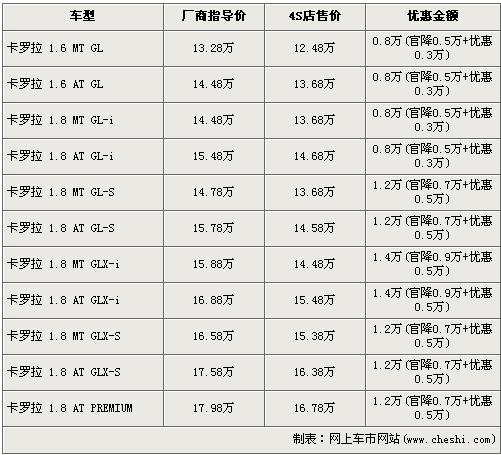 据4S销售人员介绍,前段时间官方对卡罗拉全系调整了售价,最高官方降价达到了9000元,并且近期在店内购买卡罗拉的消费者还可以得到最高5000元的优惠,累计全系最高让利达到了1.4万元。经优惠后,全系入门级的1.6 MT GL版车型售价降到了12.48万元。