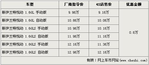 据北京现代经销商处销售人员介绍,新伊兰特悦动全系车型优惠8000元,经优惠后全系入门级的1.6L GL手动版的售价为9.18万元,是全系的最低价格。销售人员还介绍,1.6L车型现车充足,而1.8L车型店内现车有限颜色不全,欲购买无现车的1.8L车型消费者需交纳3000元现金,等一周后可提车。