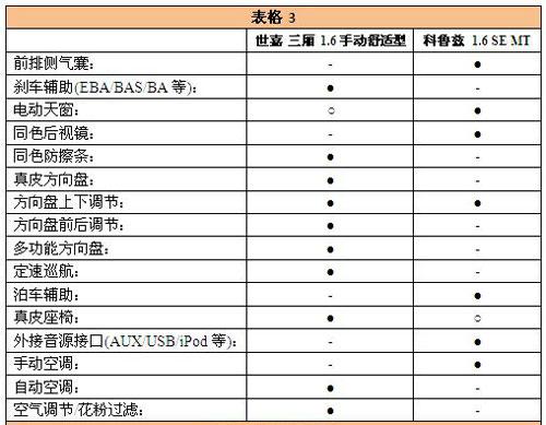 两款车的最低配车型分别为世嘉的时尚型和科鲁兹的SL版本,但三厢世嘉时尚型配置比科鲁兹高很多,甚至比科鲁兹SE也高胜一筹。安全配置方面两款低配车型都只有双安全气囊,但世嘉装备的刹车辅助系统是科鲁兹所不具备的。其它便利性或舒适性配置,二者的差距更加明显。其中比较重要的配置区别在于世嘉时尚型装备了可前后调节的多功能方向盘,上面集成了定速巡航系统,此外时尚型还配备了泊车辅助,这使驾驶者在停车时操作会更加方便。